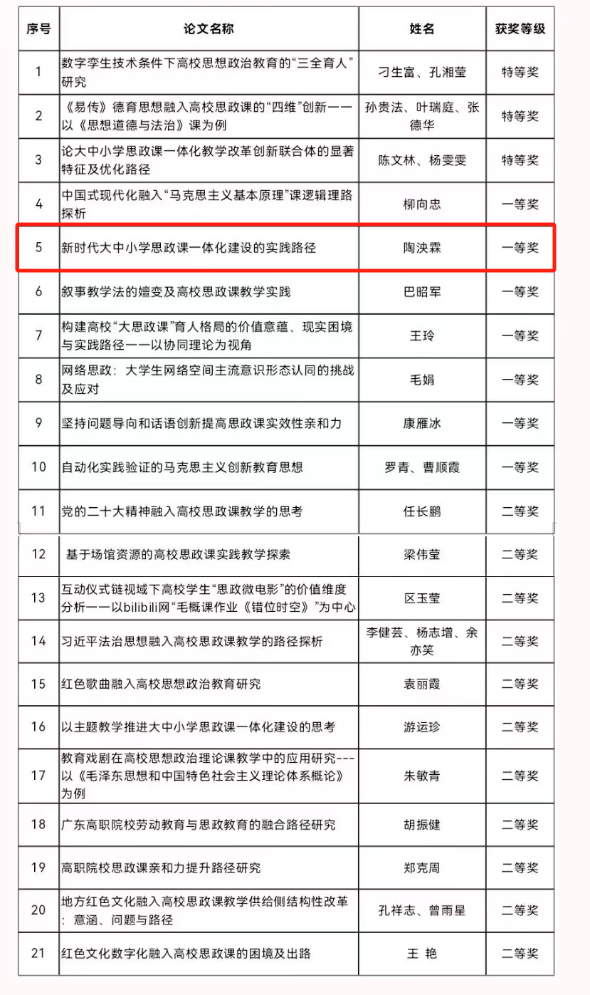 近日,广东省高校思政课区域协同创新中心揭晓了2023年度思政课优秀教研论文的评审结果。其中,我校思政课部陶泱霖老师主持的2021年广东省教育科学规划课题《大中小学思政课一体化建设背景下教学内容有效衔接研究》(立项编号:2021JKDY074)的阶段性成果——《新时代大中小学思政课一体化建设的实践路径》学术论文脱颖而出,荣获一等奖。
