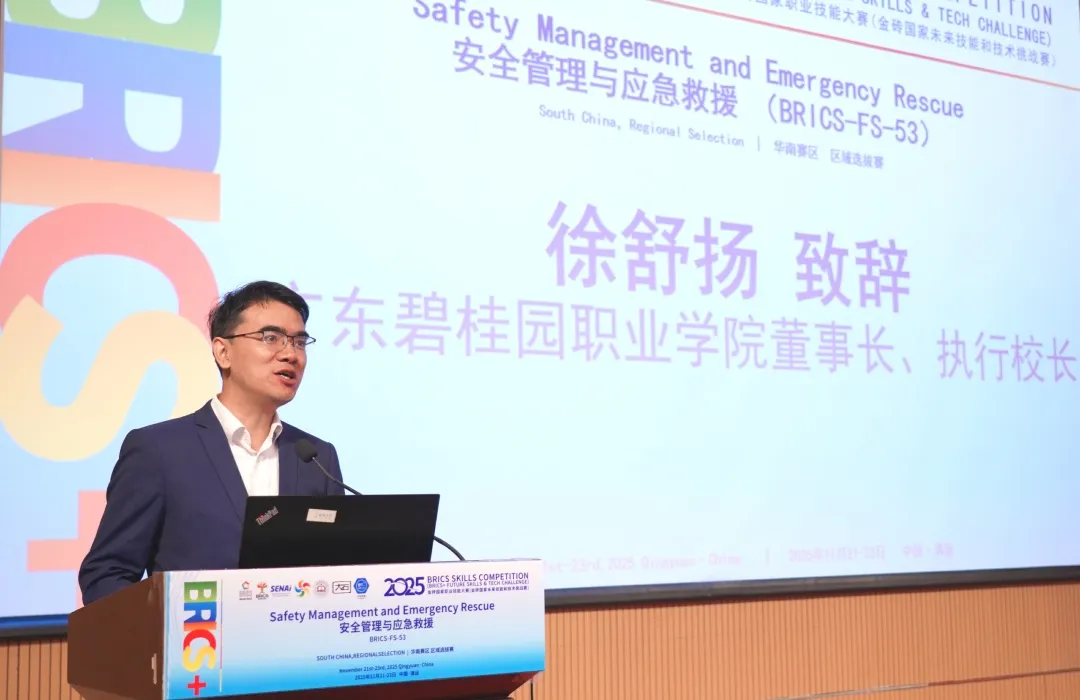 11月22日上午,由金砖国家工商理事会、巴西国家工业技能培训服务中心主办,广东碧桂园职业学院执行承办的2025金砖国家职业技能大赛安全管理与应急救援赛项华南区域选拔赛,在广东碧桂园职业学院开幕。来自广东、广西、贵州三省的近50支参赛队伍齐聚一堂,共同角逐晋级资格,展现新时代技能人才的风采。